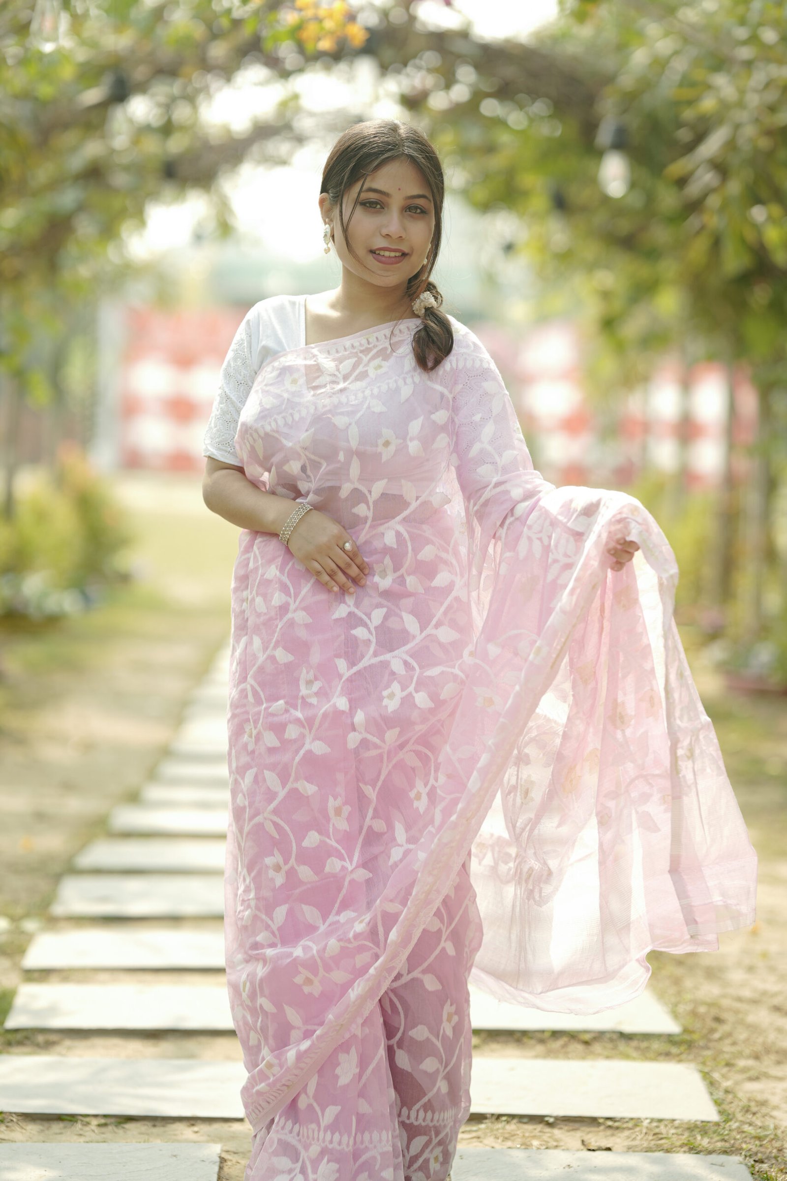 A saree is not only a saree it’s a spool of colourful threads whispering a story in each stitch.So when you drape a saree you are crowning those stories gracefully.Such a kind of saree breathes in the heart of west bengal and that is “Jamdani”.”Jamdani” is symbol of loyalty,dignity and self recognition which portrays a graphically patterned, transparent cotton fabric traditionally woven on a handloom by craftsmen.This saree originates from the Rarh region of west bengal.Transmitted through generations it upholds Bengal’s culture, strength and creative originality.The fine silk the handspun cotton makes the eyes hold on a Little more to gratify the tender elegance nurtured by hands to preserve the weaving artistry and bloom effortlessly.Unlike the prickly fabric in every touch Jamdani feels like gentle as feather and tender as own skin.It’s a hug of comfort, easy to carry and wear.The imperfections inbetween the weave adorn it as a hand weaved elegance.Jamdani is not only a saree it’s a bridge connecting past with present and every drape unfolds a story fostering strong sense of originality and cultural continuity preserved with time.