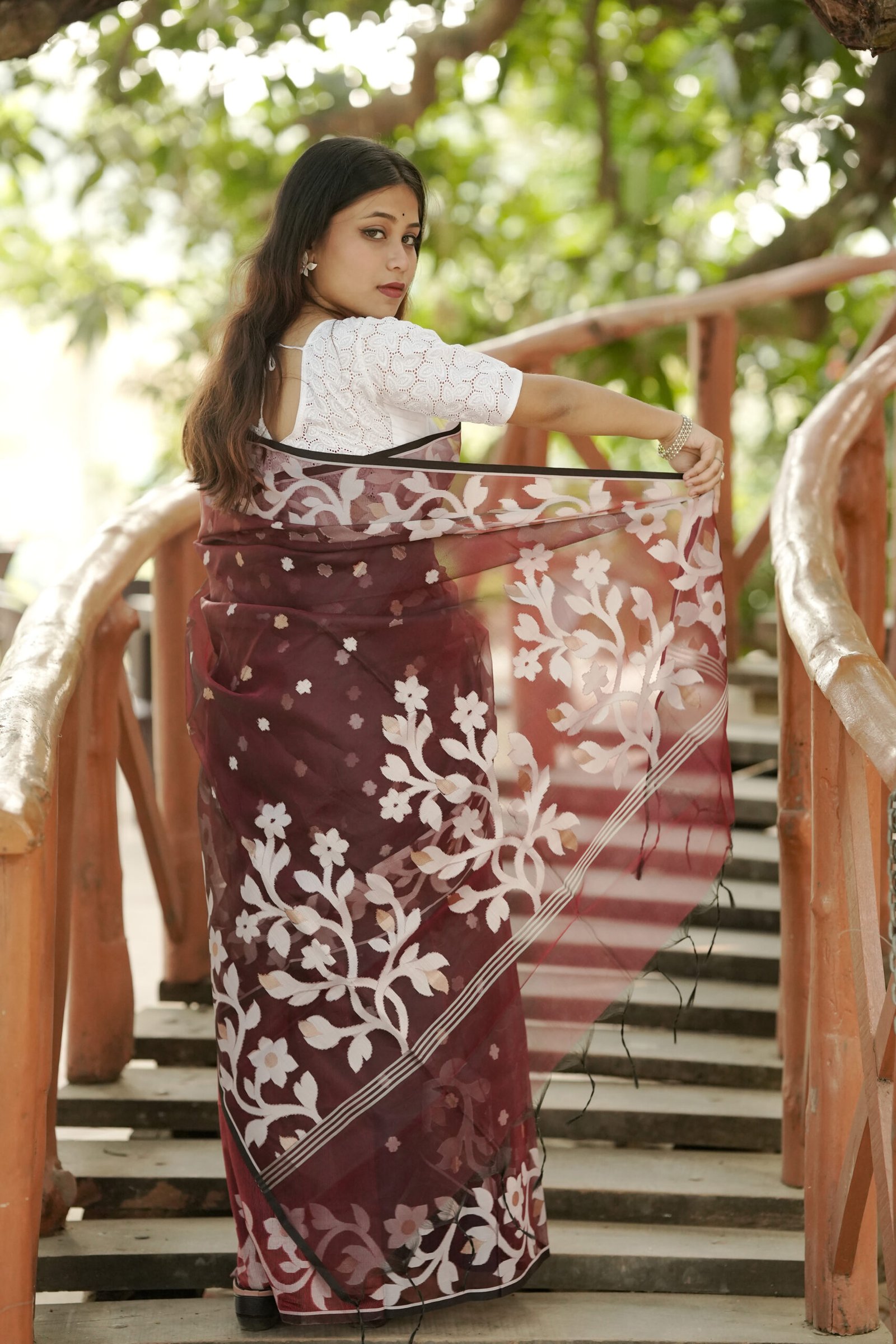 A saree is not only a saree it’s a spool of colourful threads whispering a story in each stitch.So when you drape a saree you are crowning those stories gracefully.Such a kind of saree breathes in the heart of west bengal and that is “Jamdani”.”Jamdani” is symbol of loyalty,dignity and self recognition which portrays a graphically patterned, transparent cotton fabric traditionally woven on a handloom by craftsmen.This saree originates from the Rarh region of west bengal.Transmitted through generations it upholds Bengal’s culture, strength and creative originality.The fine silk the handspun cotton makes the eyes hold on a Little more to gratify the tender elegance nurtured by hands to preserve the weaving artistry and bloom effortlessly. Unlike the prickly fabric in every touch Jamdani feels like gentle as feather and tender as own skin.It’s a hug of comfort, easy to carry and wear.The imperfections inbetween the weave adorn it as a hand weaved elegance.Jamdani is not only a saree it’s a bridge connecting past with present and every drape unfolds a story fostering strong sense of originality and cultural continuity preserved with time.