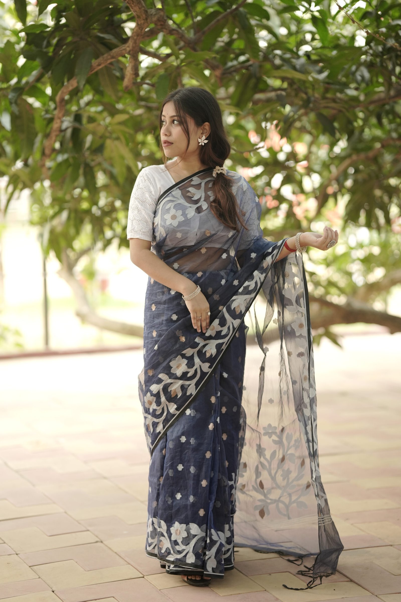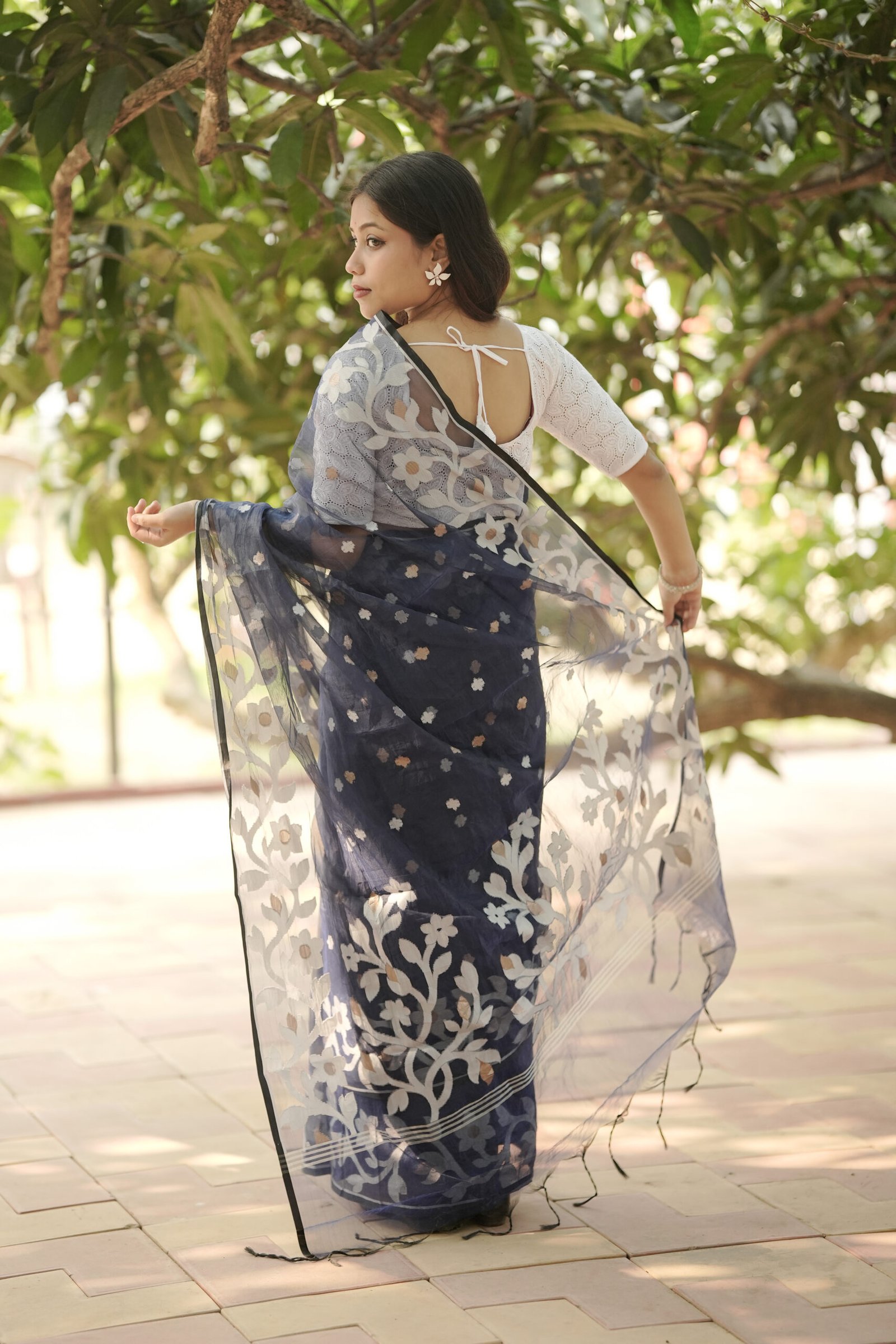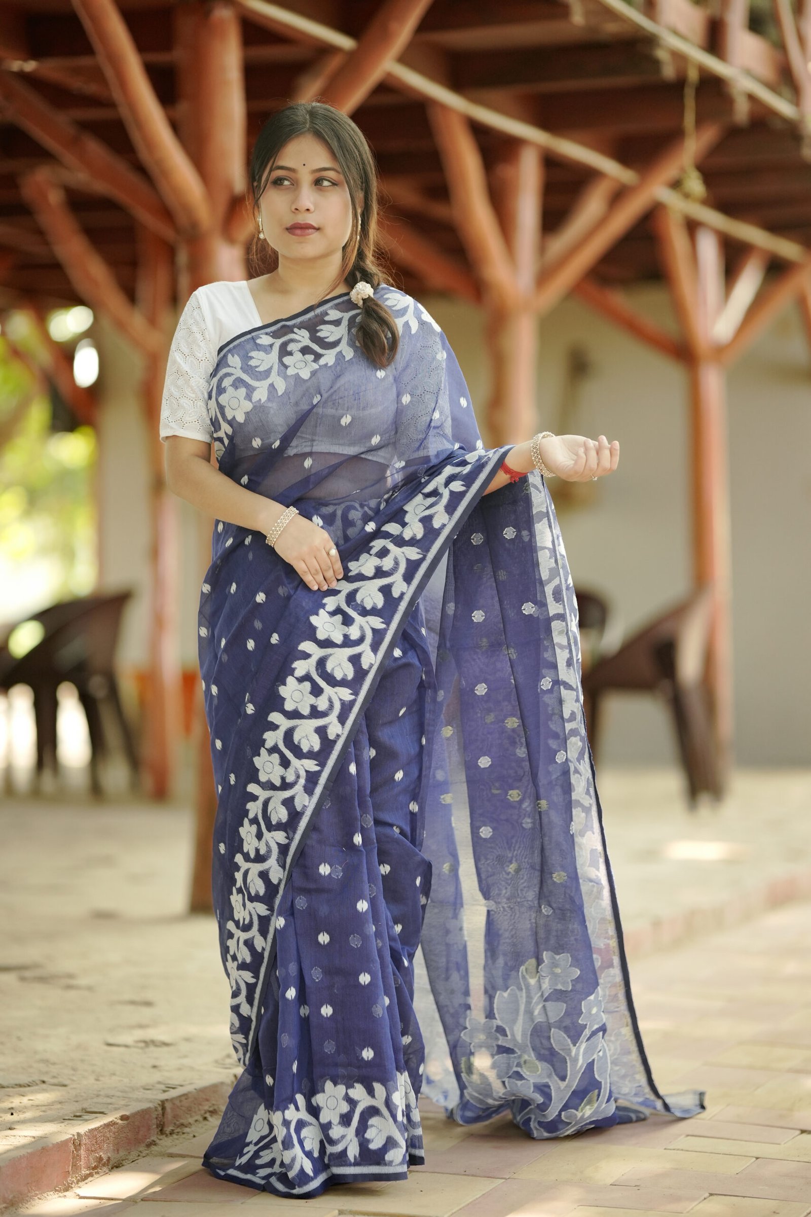 Jamdani is a profound symbol of Bengal’s handwoven heritage.Weaved with approx 120 count mulmul cotton Jamdani stands out to be a self assured comfort. Base of the fabric is typically made from a high count of fine cotton or sometimes blended with silk which lend the finished fabric its signature lightness and woven air quality.Historically worn by royalty and nobility Jamdani symbolizes wealth, prestige and aristocracy.The motifs on this fabric are created with slightly thicker thread in contrasting colours or with zari which pops up as floating appearance.Motifs are traditionally inspired by nature including geometric and floral patterns like kalka,butidar,panna hazar,Tersa.Unlike the prickly fabric in every touch Jamdani feels like gentle as feather and tender as own skin.It’s a hug of comfort, easy to carry and wear.The imperfections inbetween the weave adorn it as a hand weaved elegance.Jamdani is not only a saree it’s a bridge connecting past with present and every drape unfolds a story fostering strong sense of originality and cultural continuity preserved with time.